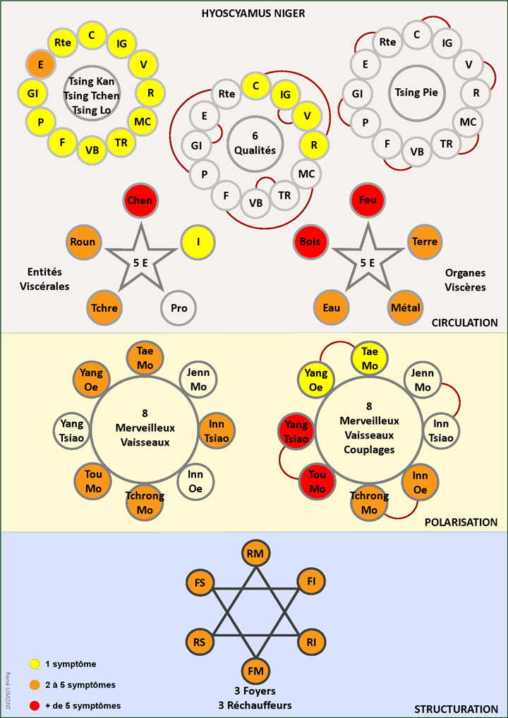 Le couple [Tou Mo - Yang Tsiao Mo] est fortement impacté : atteinte du Système Nerveux (cerveau et système nerveux moteur). Nous y retrouvons de nombreux symptômes caractéristiques des malades Hyoscyamus niger : troubles moteurs, sensitifs (perversion des perceptions) et psychologiques aussi.